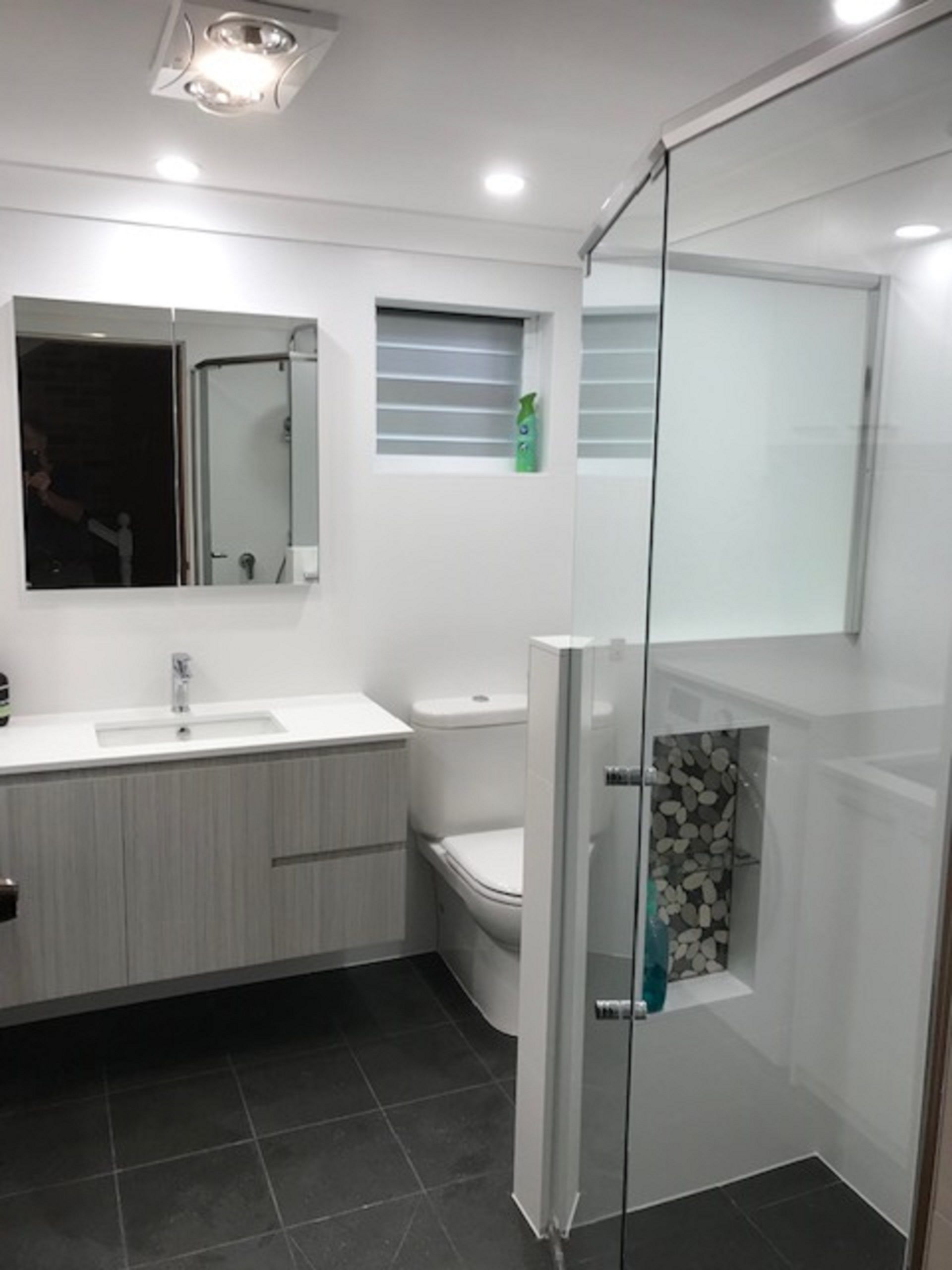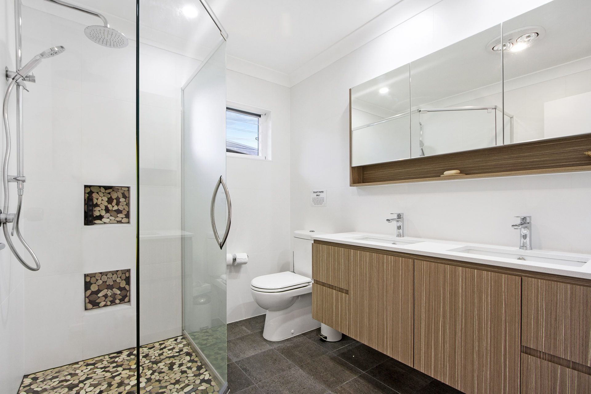 Main bathroom upstairs with a double vanity, large walk-in shower and brand new fittings.
