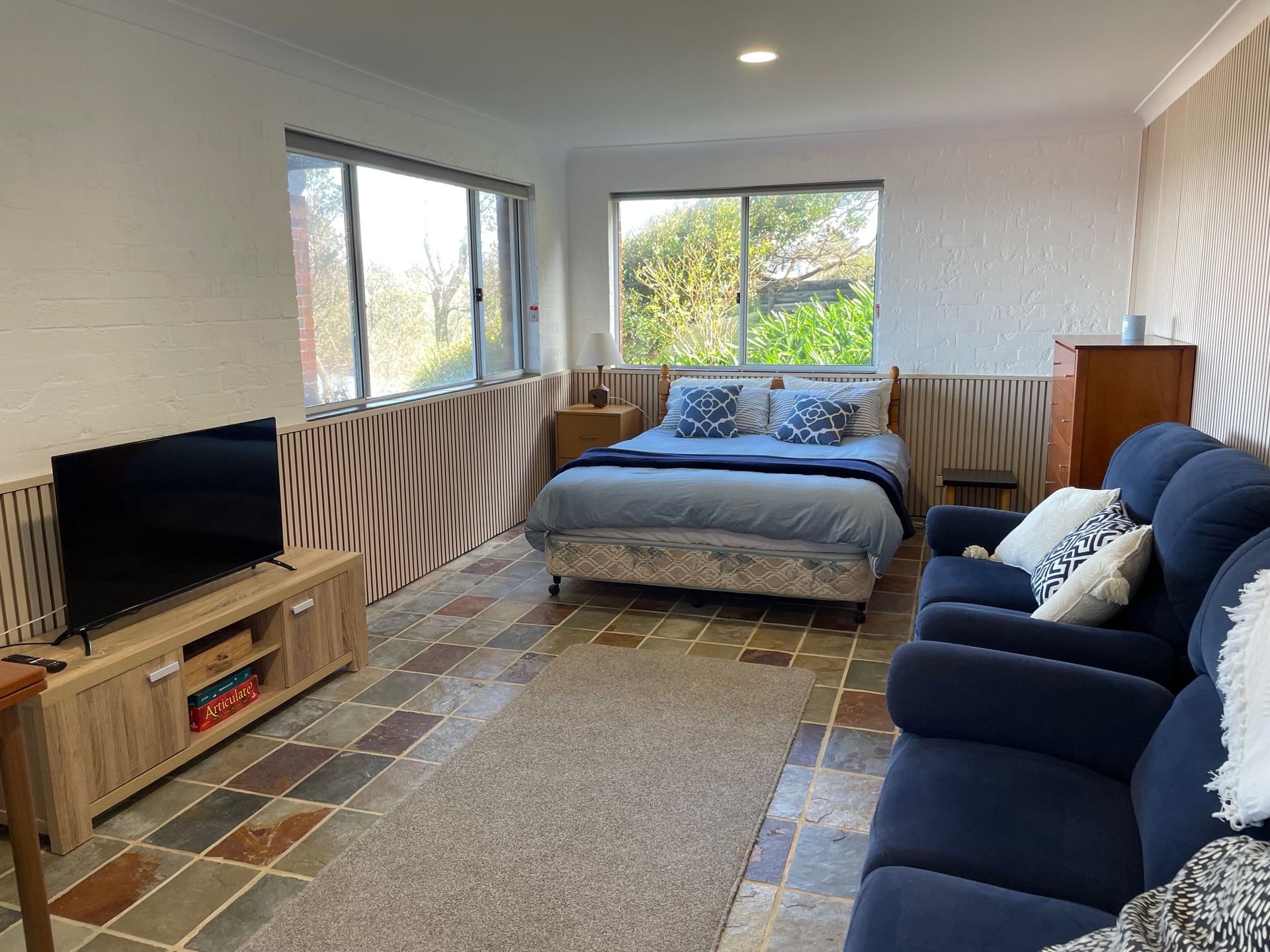 Large family room on the lower level with a queen bed, two single beds. This is ideal for a family or for all the children, as it has a second living area with TV and DVD player.