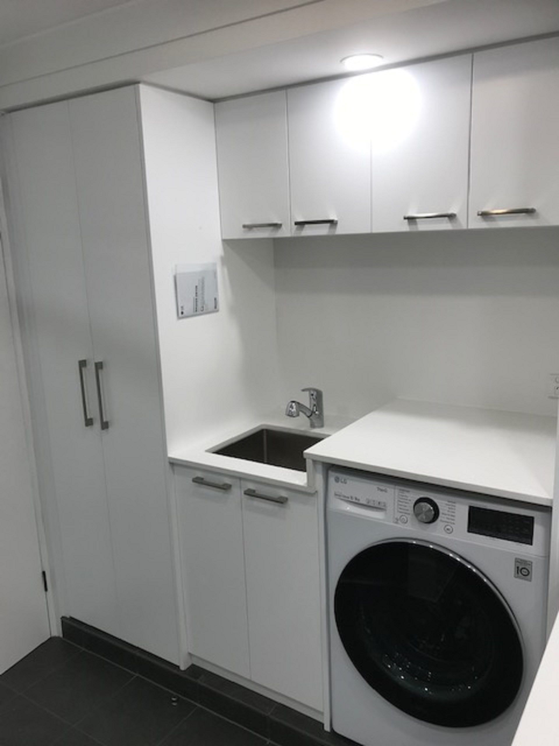 Second bathroom downstairs with a shower and toilet, top loader washing machine and laundry tub.