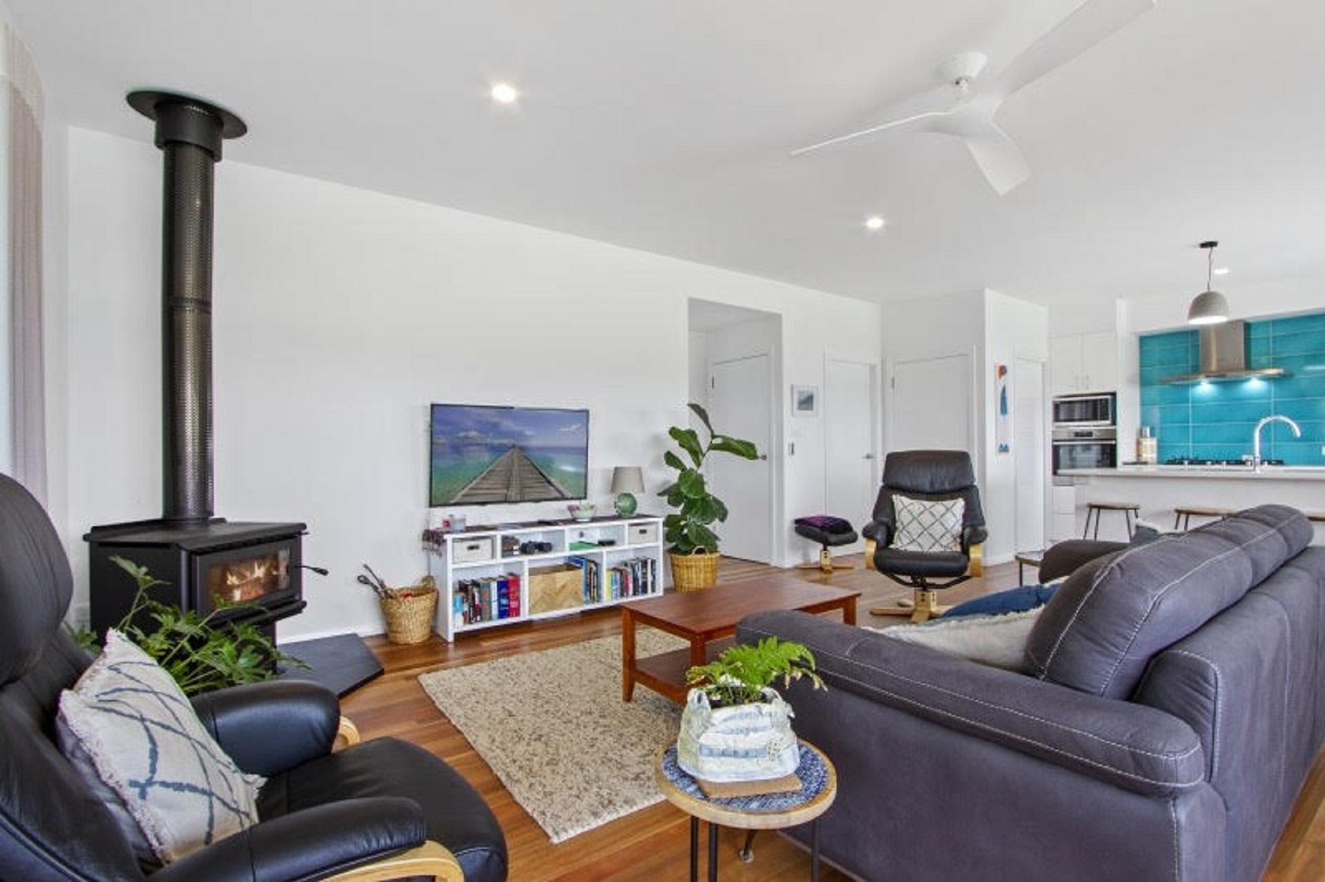 The open plan lounge room is on the top level and has a slow combustion fire, Apple TV/smart TV and ceiling fan. There are two bedrooms located on this floor. All bed linen provided along with one towel per person, bath mats and hand towels, and tea towels.