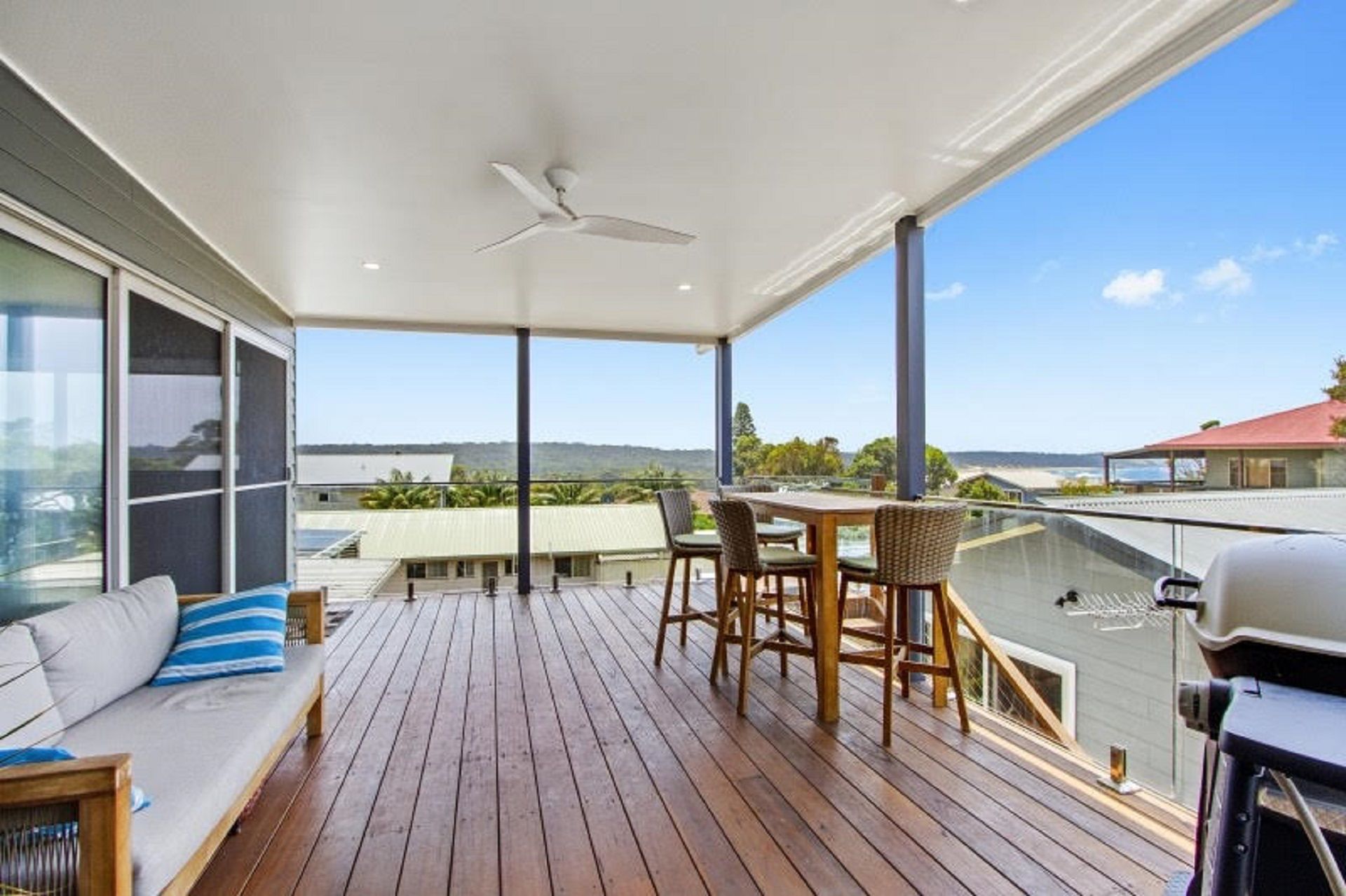 Outdoor undercover area has table and chairs, lounge and gas BBQ.