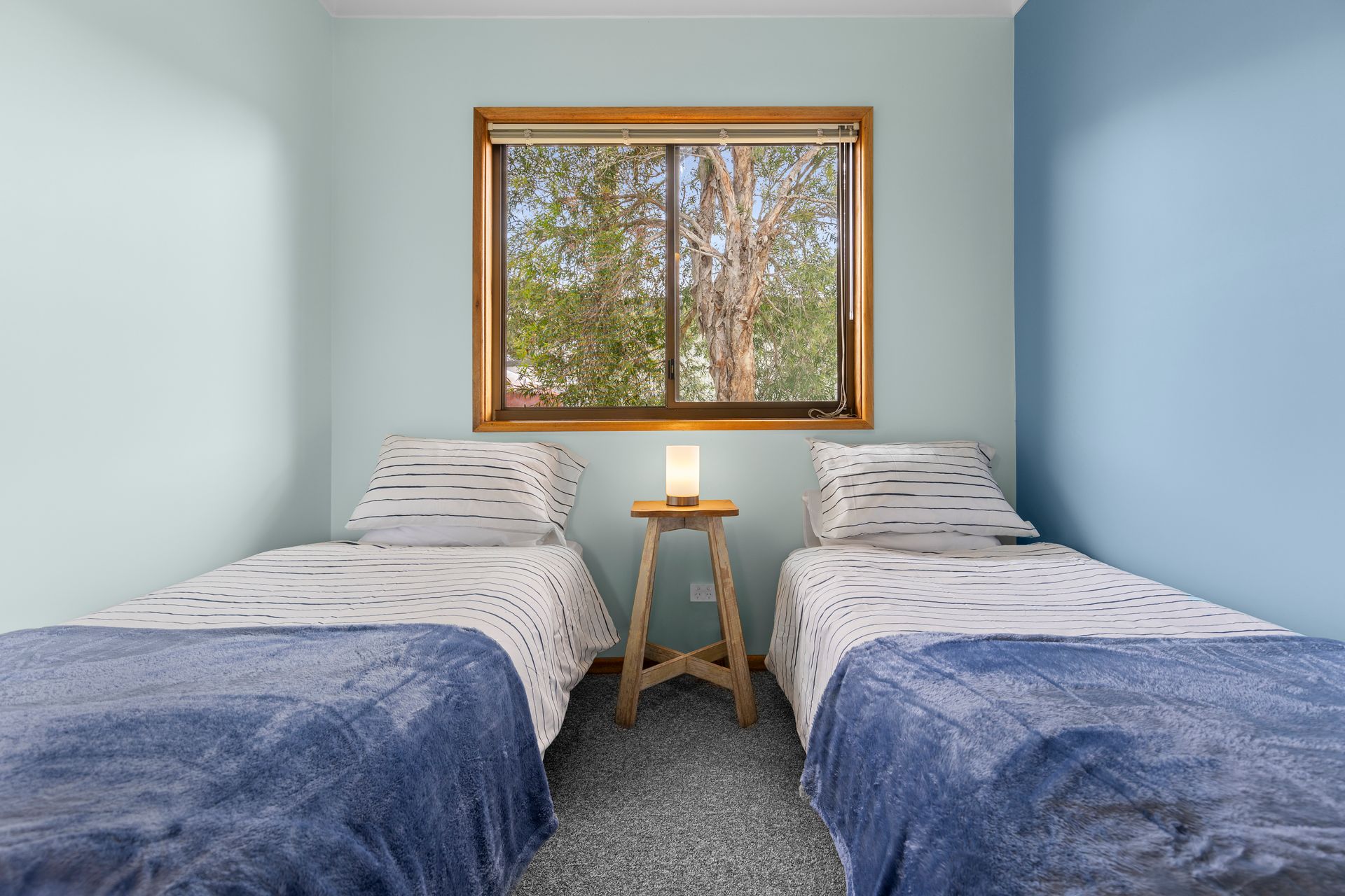 This property has two bedrooms, one with a queen bed and the other with two single beds.