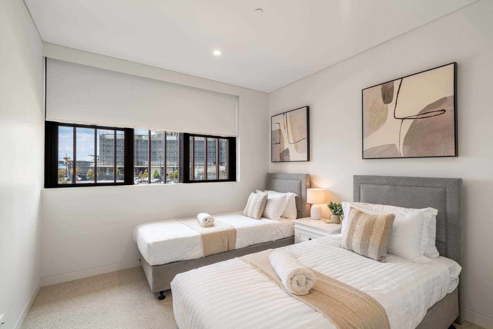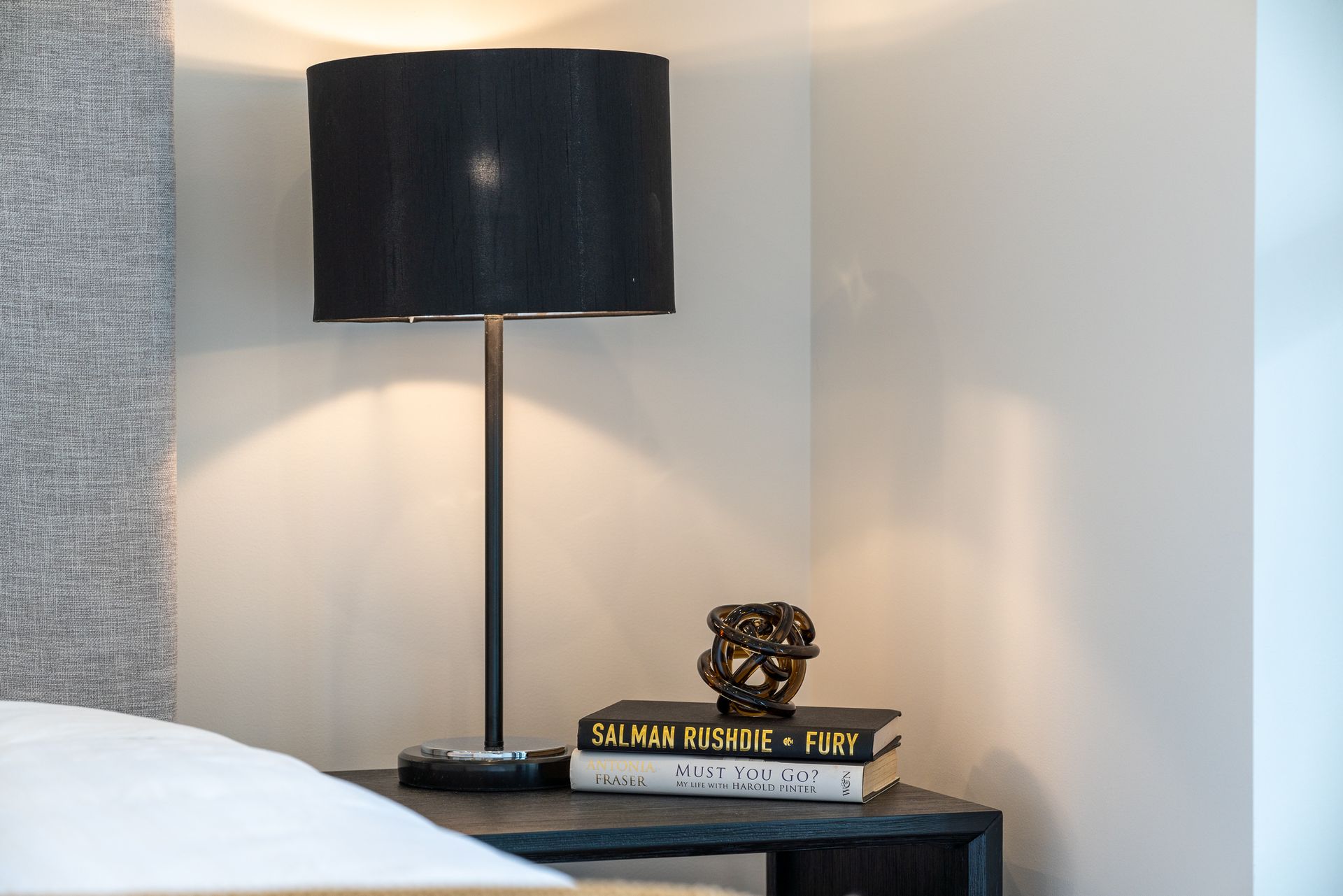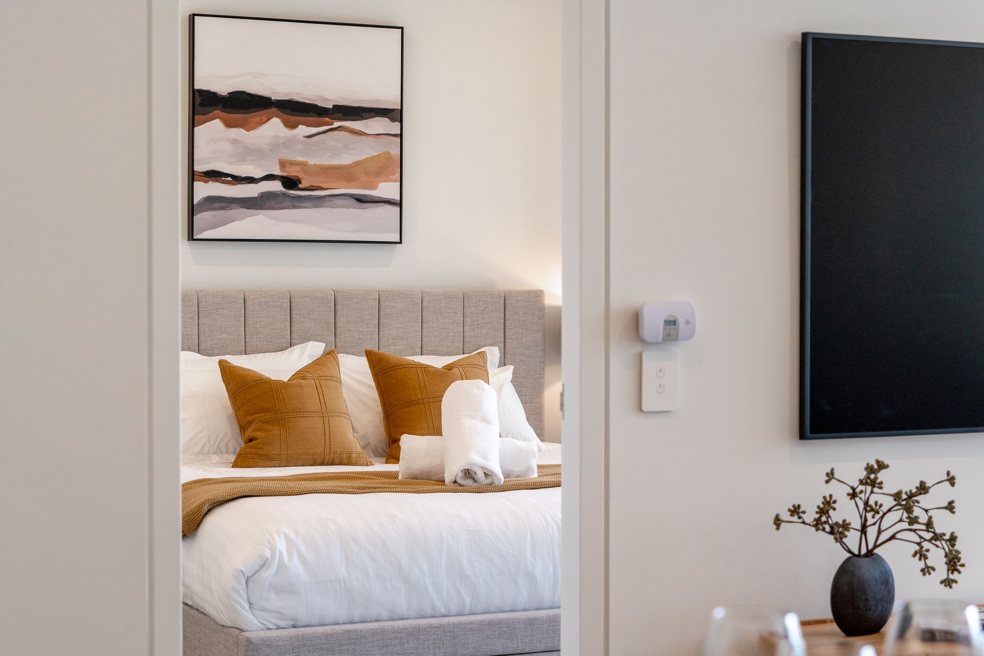 Upon entering, each bedroom greets you with cozy vibes and waterfront views. Each bedroom is fully equipped with luxury linens, clothing storage, and essentials to ensure you feel right at home. Our master suite boasts a king-sized bed and an ensuite bathroom, while the second bedroom offers versatile twin beds, ideal for both kids and adults.