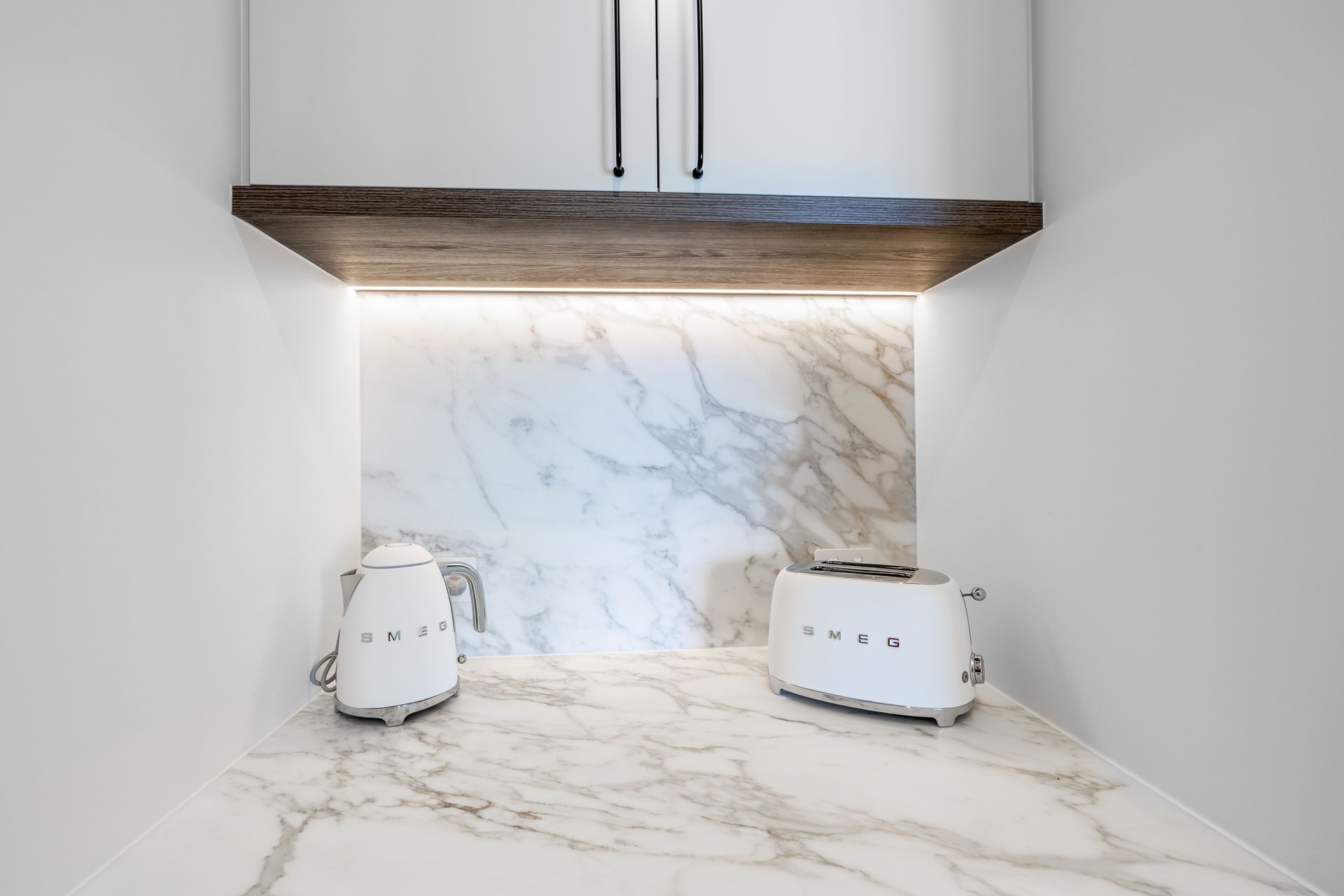 The Marina Getaway takes pride in its spacious private living room that opens out on the balcony, where you can enjoy your coffee while viewing the sun rising over the marina. Amidst the cool air conditioning, lounge around with your loved ones for board games or just simply binge-watch your favorite series on our TV.