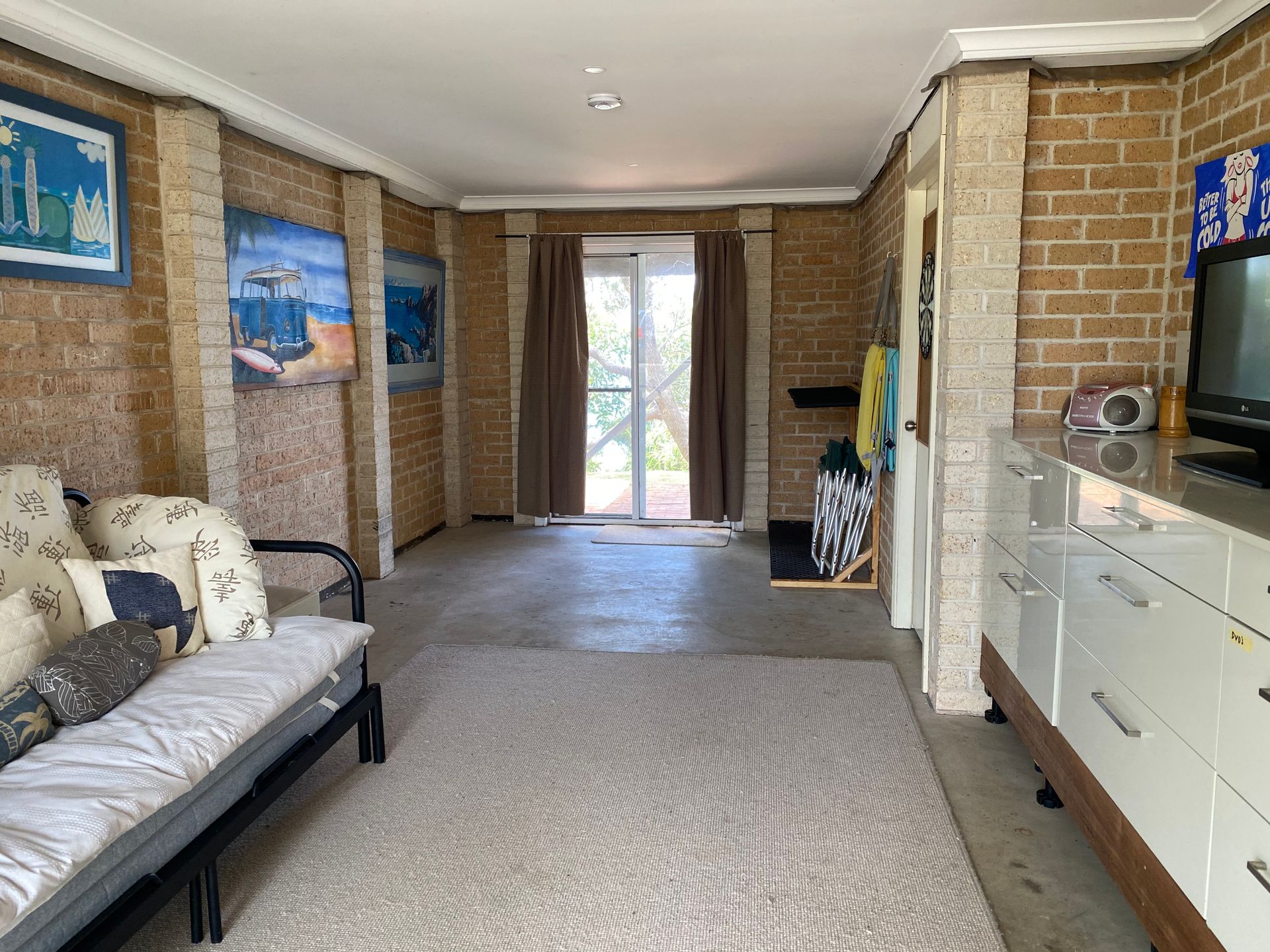 Downstairs has a second standard Tv and dvd player and comfy lounge chairs with splenty of storage for bikes and boards.