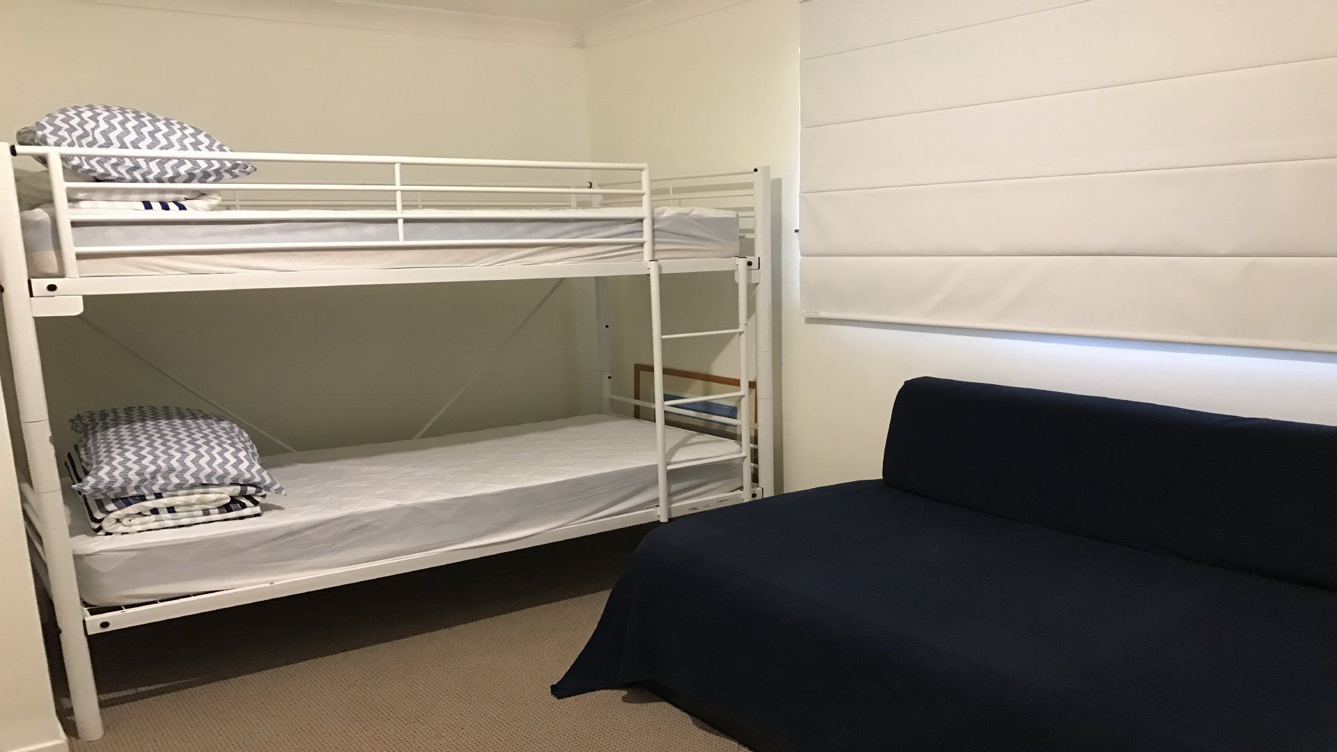 Upstairs, the spacious living area and large fully equipped kitchen provide a welcoming atmosphere for guests to relax and unwind and to come together for enjoyable meals, eaten either in the dining space or on the verandah. The main bedroom features a queen bed, while the large second bedroom offers a set of single bunks and a trundle, perfect for children, plus a TV and sitting/play area, ensuring everyone has their own space to enjoy. The main living space has a large wall-mounted smart TV, and has a split system heating/air conditioning unit.